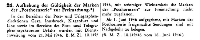 Suspension of validity of the stamps of the post horn series. In the areas of the Post and Telegraph Directions of Graz, Innsbruck, Klagenfurt and Linz as well as in the area of the Post and Telegraph Inspectorate of Urfar the regulation of 21 May 1946 [BM.Zl.10/149/1946] withdrew with immediate effect the validity of the stamps of the post horn series. Items posted from 1 June 1946 with stamps of the Posthorn series are to be surcharged. [B. M.21/10/149/46 of 16 June 1946]