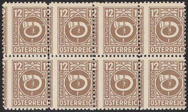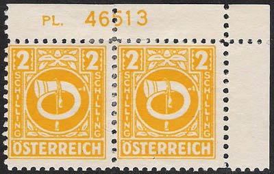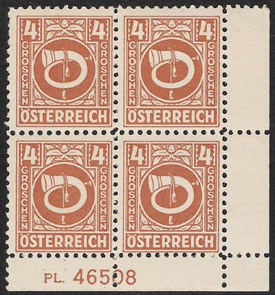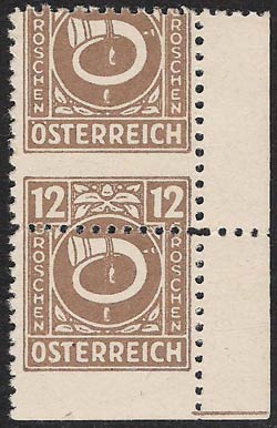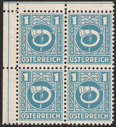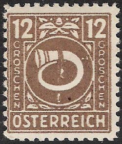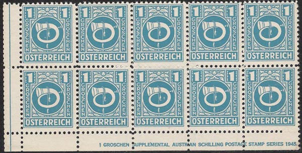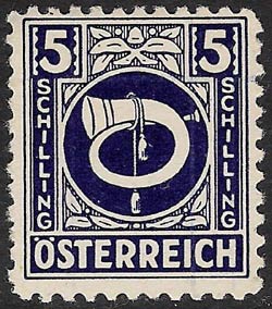 In the Post- and Telegraphenverordnungsblatt No. 7 chapter 18 of 21 May 1946, these stamps were meticulously if belatedly described: "All the values from 1g to 5S have the same design in colour on a white background, which is trimmed with simple leaf-shaped ornaments: a white Posthorn, which is entwined with a rope having tassels at its ends; in the upper left and right corners the figure of value on a dark background in white; descending from that in both margins is the denomination (GROSCHEN or SHILLING) and in the lower border the word ÖSTERREICH, all in white block capitals.".