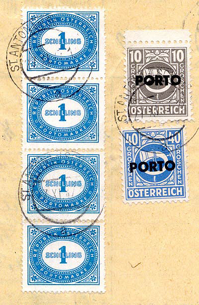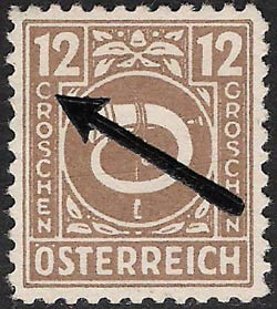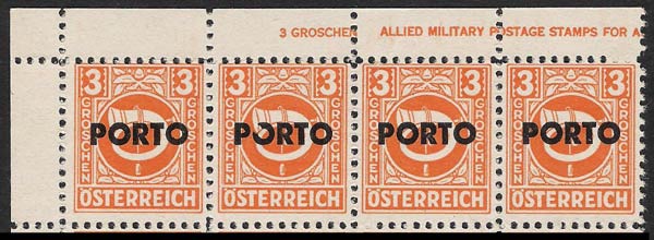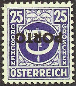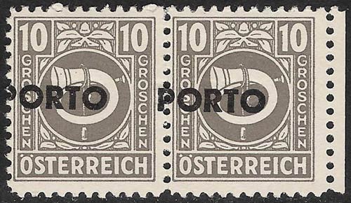 All values (except the 1 and 4 groschen) were issued in 1946 with the horizontal imprint "PORTO" for use as postage dues. These stamps are an Eldorado for plate-fault collectors. Naturally, all the plate faults of the original stamps also occur on the postage dues; in addition very many errors occur in the overprint. Especially expensive are inverted, double, and displaced overprints. Very frequent errors, which occur in all values, are the "thin first O" and the "flat-bottomed second O".