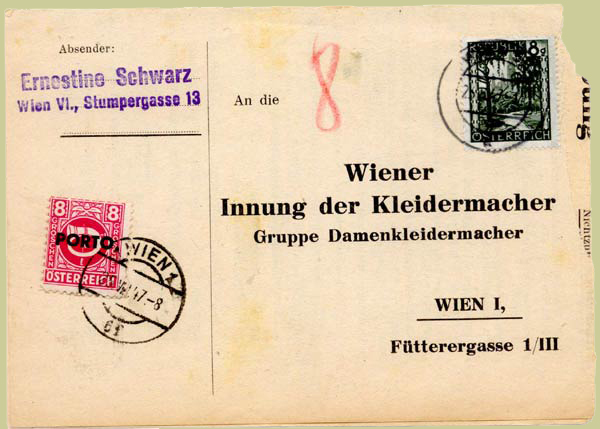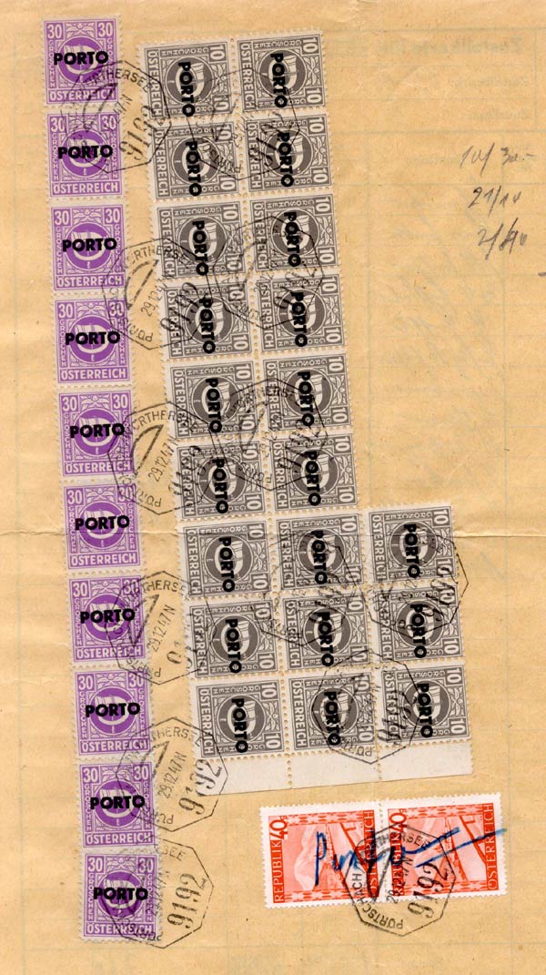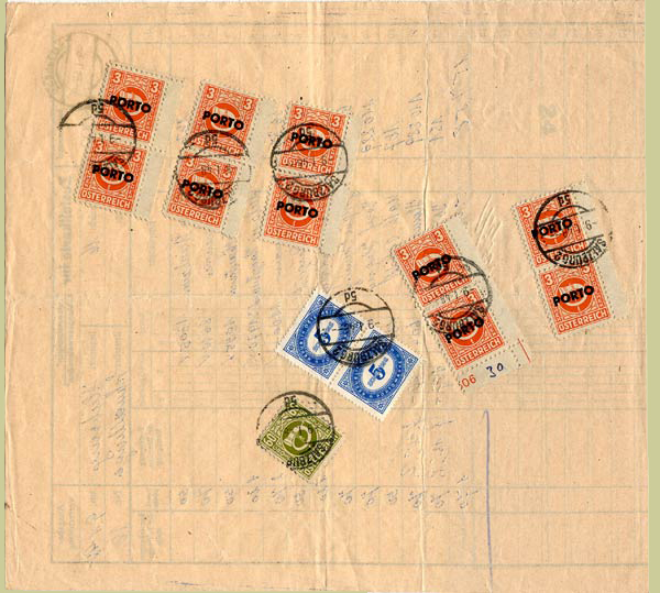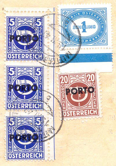 Damaged letters often occur. One finds extra bars caused by overinking around the typeface; part- or wholly-filled-in letters caused by dirt; and missing parts of letters caused by damaged type. Such pieces are very attractive to collectors!. While the stamps of the posthorn series were withdrawn on 20th December 1945 and were invalidated by 1st June 1946, the postage dues remained valid until 7th January 1948, and of course in the whole of Austria.