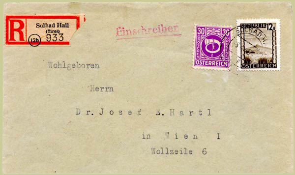 Solbad Hall in Tirol to Vienna. Mixed franking with landscape issue.