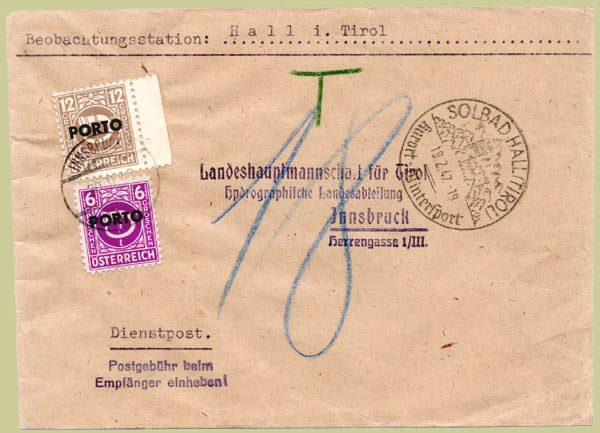After the issue of the Landscapes series began, the posthorn stamps were withdrawn from sales counters on 20 Nov 1945 (U S zone) and 21 Dec (British & French zones). They were however still valid for franking until 21st May 1946. On that date, as Dr Kainz explained (Austria 133 p64), the key regulation was issued as BM.Zl.10/149/1946; it states that "with immediate effect the post horn series stamps are no longer valid for postage". As soon as a post office knew the content of this regulation or had a copy of it, it was required to immediately levy a surcharge on a letter bearing a post horn stamp. This is why some offices charge postage due before 31 May 1946 (the commonly-quoted end date). However, these stamps can be found used on internal Post Office forms as late as 1948.