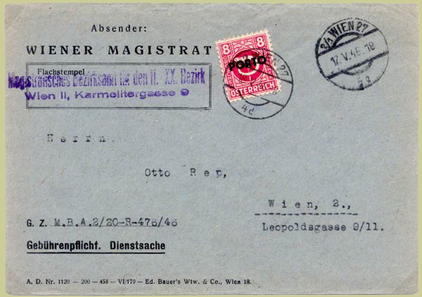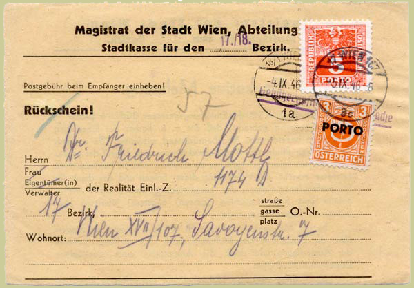 An article by the late Dr Christine Kainz in Arbeitsgemeinschaft Österreich e.V's Rundbrief Nr. 52 cleared up the uncertainties over the withdrawal date of the Posthorn Series (ANK697-713) brought to Austria by the Allies, and the subsequent levying of postage dues on items franked with them in the period 21 May - early June 1946.