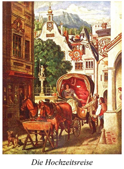 The painting, which is now in Munich's Neue Pinakothek, is called The Symphony. The stamp design was taken from the top panel of the picture, which is The Honeymoon. There is however a different painting by von Schwind in the Schack Gallery in Munich, called The Honeymoon in English and Die Hochzeitsreise in German, and shown here on the left.