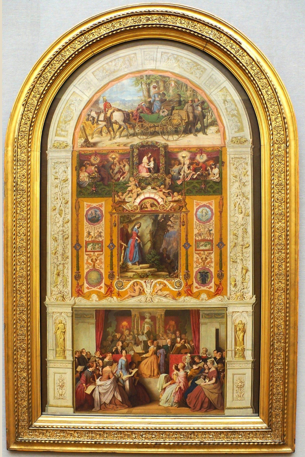 Von Schwind painted it in 1852 from drawings made in 1848-49. It was to be one of three great paintings for the walls of a music room; the one to Haydn was never started, that to Mozart was left incomplete in 1852, but this one to Beethoven was finished in honour of Karoline Hetzenecker; an opera singer friend of von Schwind. In 1849 Karoline had married Dietz von Mangstl and this painting recorded their meeting, courtship and marriage. The painting was arranged as follows, and the whole was enclosed in an ornamental surround. It is 1690mm high by 1000mm wide! The sections are 1: The Honeymoon; 2: Carnival Time; 3: The Proposal; 4: Ganymede; 5: The Secret Meeting; 6: The Concert Hall. The story of the picture is told by von Schwind in a letter dated 24th November 1849 to his friend Schädel as follows:/