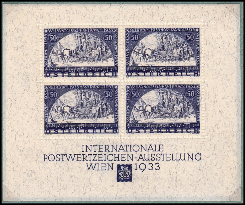 BUT, to be permitted to purchase a stamp you had to have purchased an admission ticket (at 1S60) and then hand over the stub; for a block you had to purchase a more expensive ticket (contrary to what some catalogues say). The stamps could be obtained by post (while stocks lasted) from the WIPA office, at prices "which included the appropriate admission charge". One can deduce that the effective cost of a single stamp was 2Sch60 while the block-of-4 was 10Sch40 - doubtless plus P&P.