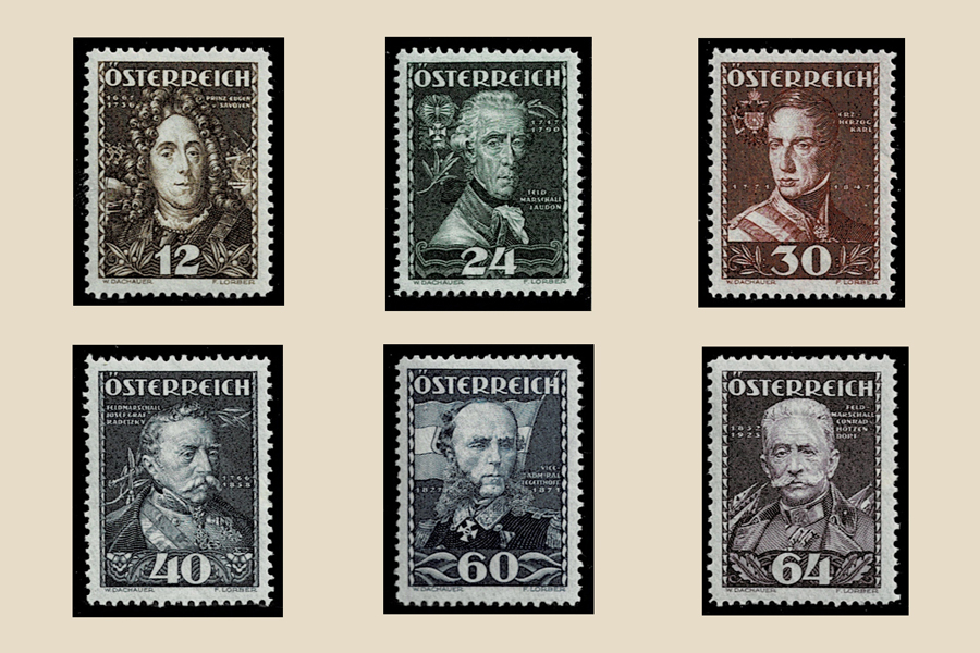 30g maroon Archduke Charles: Erzherzog Carl Ludwig Johann Joseph Laurentius von Österreich, Herzog von Teschen; born 5.9.1771 in Florence; died 30.4.1847 in Vienna.