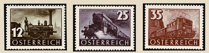 This set of stamps, issued on 22nd November 1937, would be more correctly described as commemorating a century of steam traction since only one Austrian mile of track, from Florisdorf to Deutsch-Wagram, was actually opened on 23rd November 1837. Nevertheless, on 23rd November 1937, a memorial was unveiled at Florisdorf, and wreaths were laid on the grave of Franz Xavier Riepl, the engineer who built the line. He was born 29.11.1790 in Graz, and died 25.4.1857 in Vienna. He was Professor of Commerce and National History at the Vienna Polytechnic Institute, later Director of the Kaiser Ferdinand Northern Railway. This set was valid for postage until 31st October 1938. Three special stamps, line perf 12½, were issued as follows: