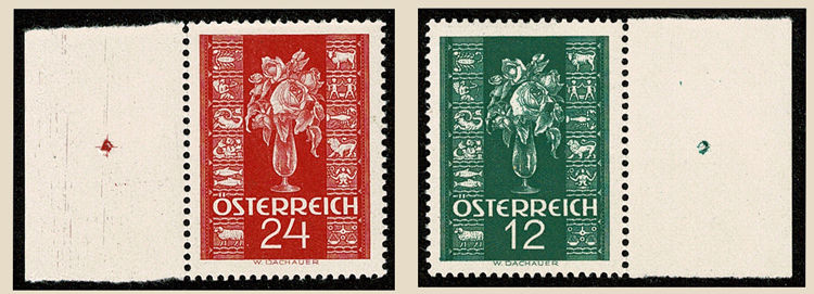Professor Dachauer's accepted design was a vase of roses, framed by the signs of the Zodiac, in two values: 12 groschen blue-green and 24 groschen carmine (which were the inland postcard and inland letter rates at that date.) The stamps were recess printed at the State Printing Works in Vienna, comb perforated 13 (the 24gr is also known imperf) and were valid for postage until 31st October 1938. The number issued is unknown. The 12g can be found with plate numbers 1 - 6, the 24g with 1 - 4. Both exist imperf; as pairs-imperf-between; and in unissued colours. The signs of the Zodiac can be clearly discerned in the two vertical columns to either side of the stamps. From top to bottom: left hand side: Scorpio, (the scorpion), Sagittarius (the archer), Capricornus (the goat), Aquarius (the water carrier), Pisces (the fishes) and Aries (the ram); right hand side: Taurus (the bull), Gemini (the twins), Cancer (the crab), Leo (the lion), Virgo (the Virgin) and Libra (the scales). The roses are based on Hybrid Tea types.