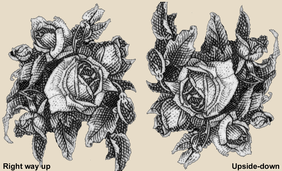 Herr Palmer's mother told him later that she had known Professor Dachauer personally, and that he had often assured her that he had hidden the three politicians in the roses. Allegedly, she added, he got into trouble over this after the issue of the stamps. If one considers Dachauer's stamp designs, one might conclude that he could have had a certain tendency to the right-wing body of thought. Frau Palmer thought that he could also have been active in some illegal areas. But all that is history. Now however to the stamp itself [some imagination may be useful]. The politicians are easiest to find if one covers the rest of the stamp so that only the indicated roses become visible; for your convenience the image is shown both right-way-up and upside-down. The three politicians are hidden in these roses: