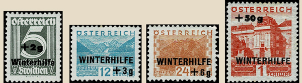Although most of the charity stamps to date had either been provided with surcharges or had been sold at a multiple of the face value, this was the first set of Austrian stamps where specific reference had been made to "WINTERHILFE" or "Winter Relief". Presumably, as in Germany, the "Winterhilfe" in Austria had as its motto "no-one shall go hungry and cold" since anyone could ask for help and be given clothing, food or fuel or small amounts of money. The "Winter Relief" fund was thus a means of dispensing personal charity. Four stamps were selected from previous definitive sets, printed in new colours, and given surcharges: