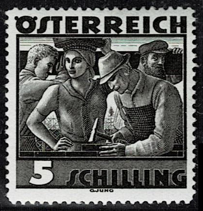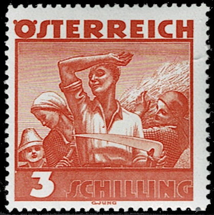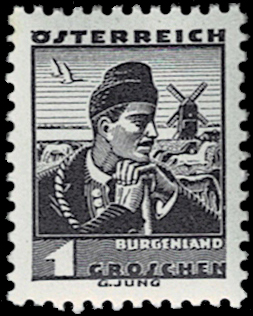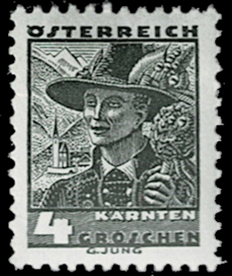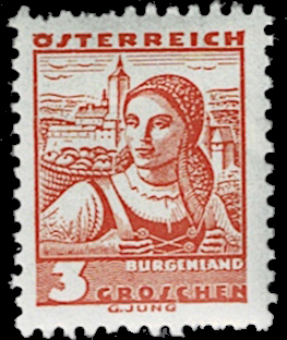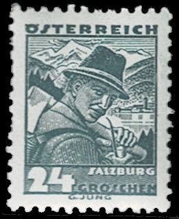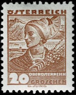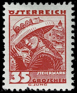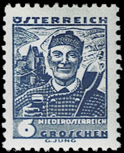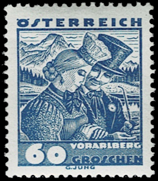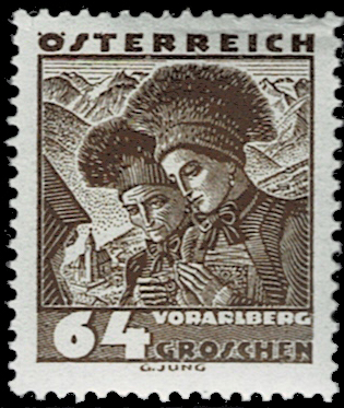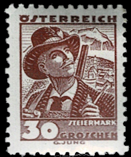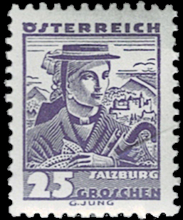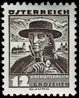The "Costumes Series", which started to appear on 15th August 1934, was probably planned by the government of Dollfuss to symbolise the unity of the country since it displayed the costumes traditionally worn by the peasants, workers and soldiers in the various federal provinces of Austria. The design was entrusted to Georg Jung who had been born in Salzburg in 1899 and who specialised in production of portraits and figures. Some of his preparatory designs are illustrated in "100 Jahre Österreichische Briefmarke".