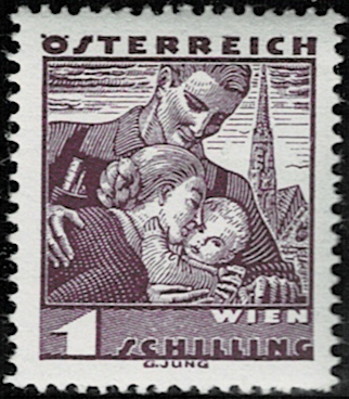 ![]() | An artisan and his family from Vienna. 1S purple. He wears his overalls with tools in his breast pocket. The spire of St. Stephen's Cathedral rises in the background | |