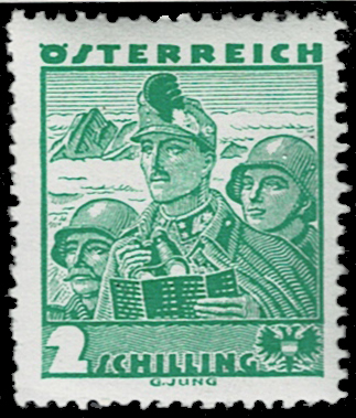 ![]() | 2S. An army officer and two soldiers of the Kaiserschützen Regiment of the Tirol with a typical Tirolese background. The officer carries a map and a pair of field glasses. Dollfuss served in this regiment of "Tirol Rifles" throughout World War I. The original grey-green stamp (left) has a larger eagle with five feathers; only 87,600 were printed. The later emerald stamp (right) has the same design but has a smaller eagle with seven feathers. Some 'grey-green' stamps are chemically-changed 'emerald' stamps - count the feathers! | ![]() |