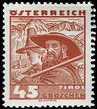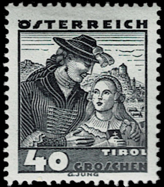 ![]() | Peasants from Tirol. 40g slate grey, 45g chestnut. On the 40g is shown the famous Zillerthal hat with two gold tassels hanging in front of a crown and brim of black felt. The cross-lacing on the coat and the lace on the sleeves are unusual. Behind the couple is the fortress of Kufstein. The couple on the 45g are from the Kalsertal; behind them is Lermoos and the Wetterstein mountain. There the women still retain their peaked hats made of black felt and with a stiff brim. The men wear a broad-brimmed felt hat. | ![]() |