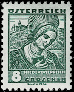 ![]() | Peasants of Lower Austria. 6g blue, 8g yellow-green. The man from the Wachau (Aggstein) is a vine-grower or vine-dresser and the apparatus in his left hand is a glass Weinheber which is a combination of a bottle with a tube used for taking samples of wine out of the barrel. The woman's strange stiffly-pleated head dress is worthy of note as well as her beautifully embroidered dress. She carries her prayer book in her hand and is wearing her national costume for church going. Rosenburg im Kamptal may be seen in the background of the 8g stamp. | ![]() |