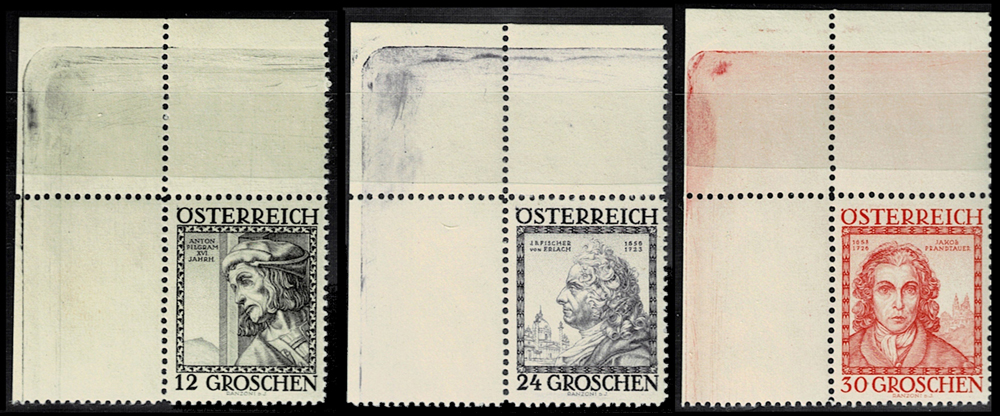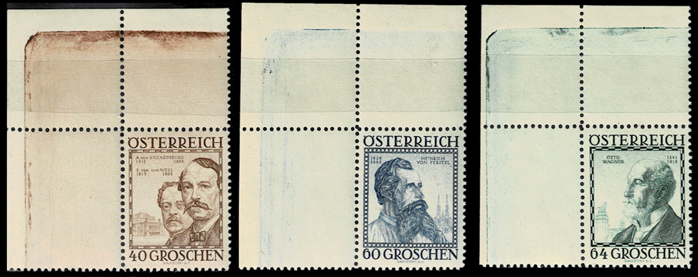 Continuing the tradition of portraying famous Austrians, the Christmas Charity Set of 1934 was devoted to Austrian architects. A new designer was selected for both the designing and the engraving of this set - Hans Ranzoni the Younger, who was to produce many beautiful stamps for the Second Republic. He was born on 6th September 1896 in Vienna as the son of Professor Hans Ranzoni the Elder. In 1940 he married Edith Riedel who was also to design a set of stamps, in 1949. A set of five preparatory designs for this set by Hans Ranzoni is shown on page 36 of the "100 Jahr Osterreichische Briefmarke" book. These have small but interesting differences from the actual set of six values which appeared on 2nd December 1934 and depict: