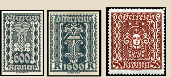 All of these stamps were perforated 12½, the “agriculture/industry” stamps on a comb machine and the “arts” stamps on a line machine. For the “arts” stamps, the 20, 25, 50, 100, 200 and 1000Kr values were also issued with a line perforation 11½; the 50Kr stamp is known as a rarity with a line perforation 11½:12½; and the 50, 200, 1000 and 2000 Kronen values are found in pairs imperforate between.