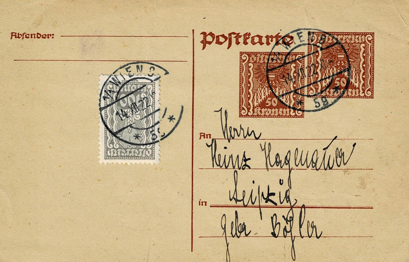 50kr imprinted card uprated with another 50kr imprint and a 100kr adhesive. 14-12-1922