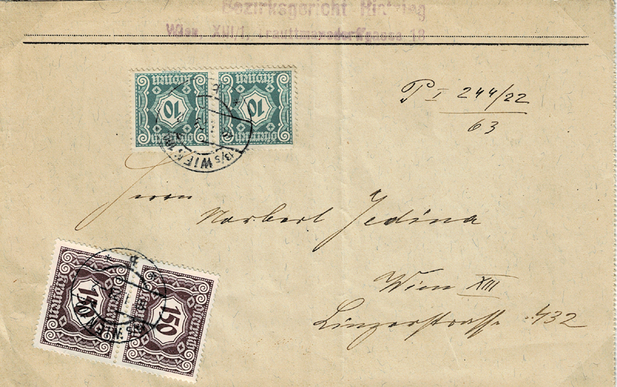 A Summons sent 10-1-1923 to attend court on the 15th. Recipient-to-pay, at standard local letter rate of 320kr.