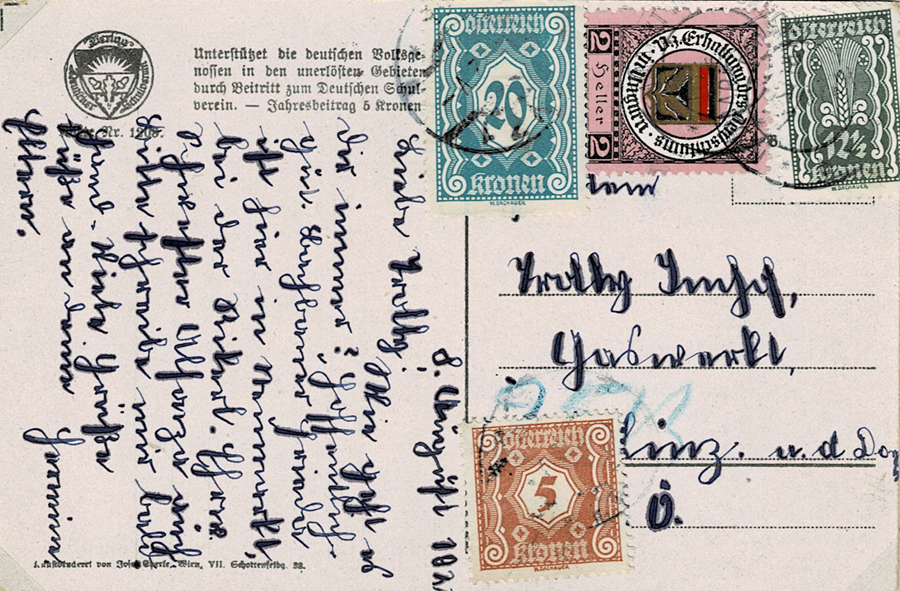 Postcard correctly franked 12½kr; but propaganda label next to the adhesive makes this a letter, which requires 25kr. Underfranked 12½kr, charged double-deficiency ie 25kr.