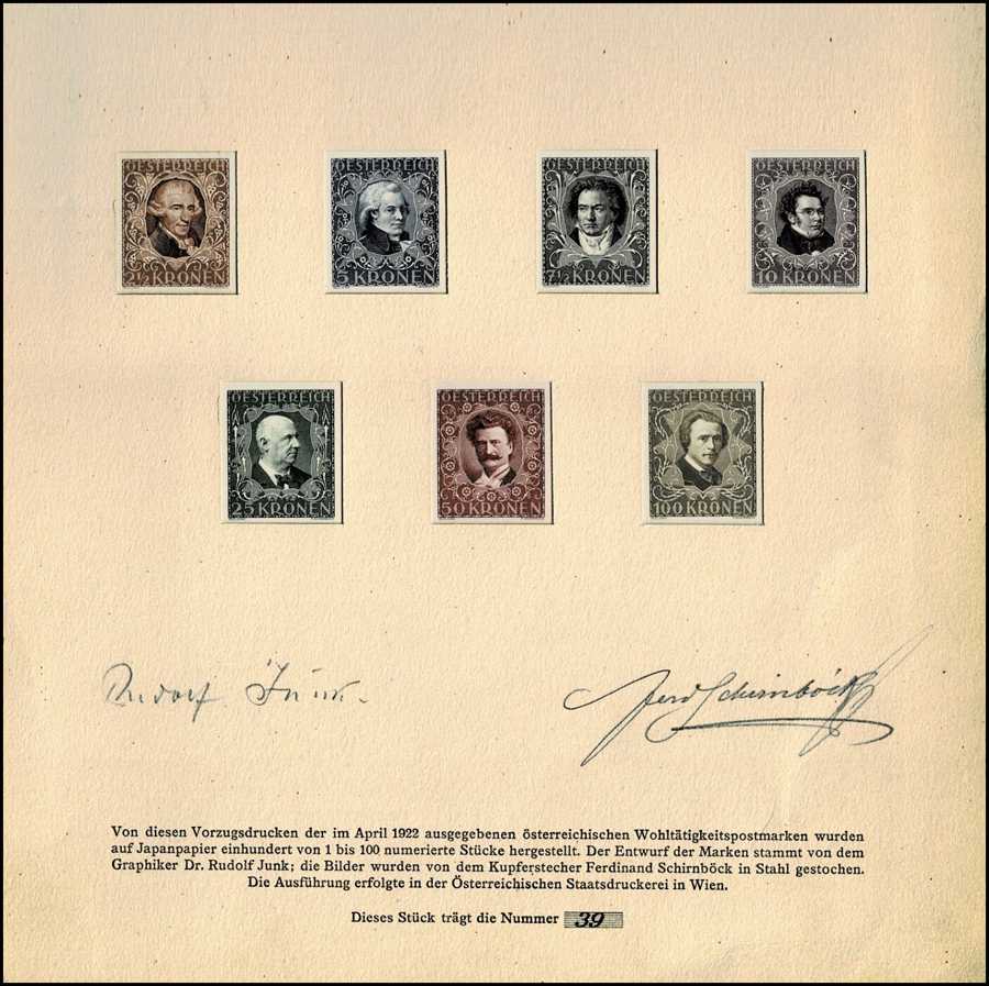 The next illustrations show the "presentation folder", where the stamps are displayed behind cutout windows in a sheet of heavy 'Japan' paper which is signed by the designer Dr Rudolph Junk and the engraver Ferdinand Schirnbock. There were 100 folders issued; this is nr 39. The stamps are printed on heavy Japan paper, and numbered; this illustration shows the stamps themselves (with the presentation folder folded back)