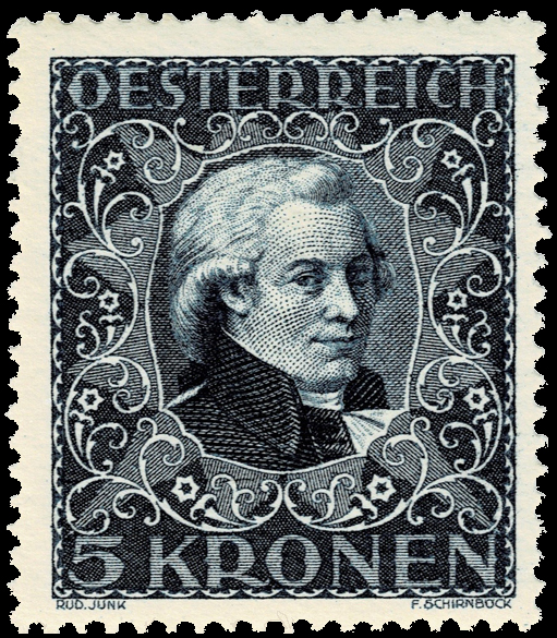 During the disheartening period after the First World War the Austrian Post Office started to issue sets of Charity stamps to raise funds for categories of needy persons. These stamps usually consisted of a beautiful portrait or view contained in an elaborately designed decorative frame; a tradition which started in 1908 and which continued into the Second Republic. The first of these sets appeared on 24 April 1922 and depicted seven famous Austrian composers. (OK, Beethoven was born in Bonn and Mozart in the then independent country of Salzburg.)