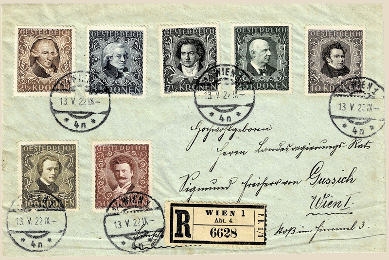 This complete set (40kr overfranked) was sent on 13 May 1922 from Major Rudolf Wadty / Wien IV / Fleischmanngasse 1 to Hochwohlgeboren / Herrn Landesregierungs-Rat / Sigmund Freiherr von Gussich / Wien I / Stoß im Himmel 3.