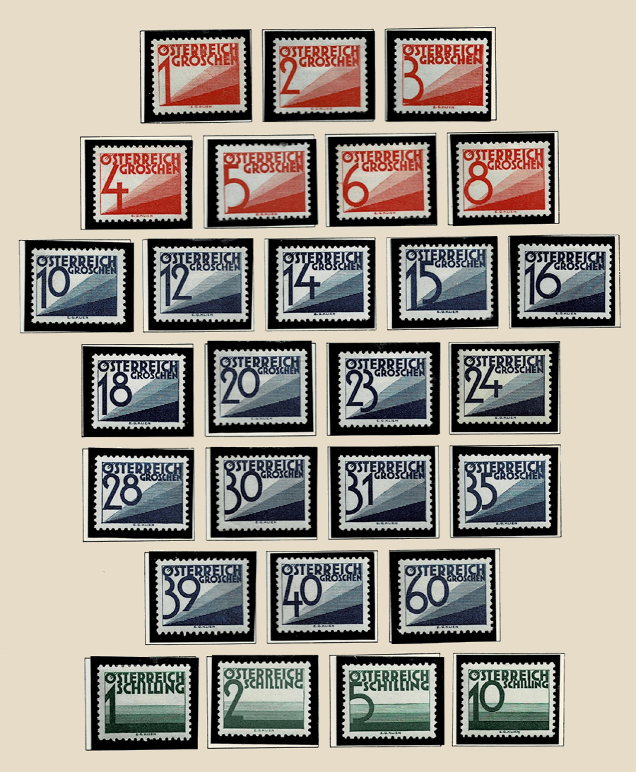 The stamps are introduced and described in the same decree (PTVOB 1925/32 I99) as the new definitives. The postage dues are a rectangular shape; the printed area of which is 22mm wide and 16mm high. The stamps were designed by Erika Giovanna Klein, whose name is on the bottom margin. The groschen values are divided diagonally from the bottom left to the top right, the bottom half of which is divided by rays which go from the left corner into three fields in the form of wedges. The bottom field is fully printed, the middle one is strongly shaded and the top one is delicately shaded, so that the stamp colour appears in three different gradations of tone. The schilling values are divided horizontally into two fields; the bottom field shows, in three horizontal stripes, the same gradations of tone as the groschen values.