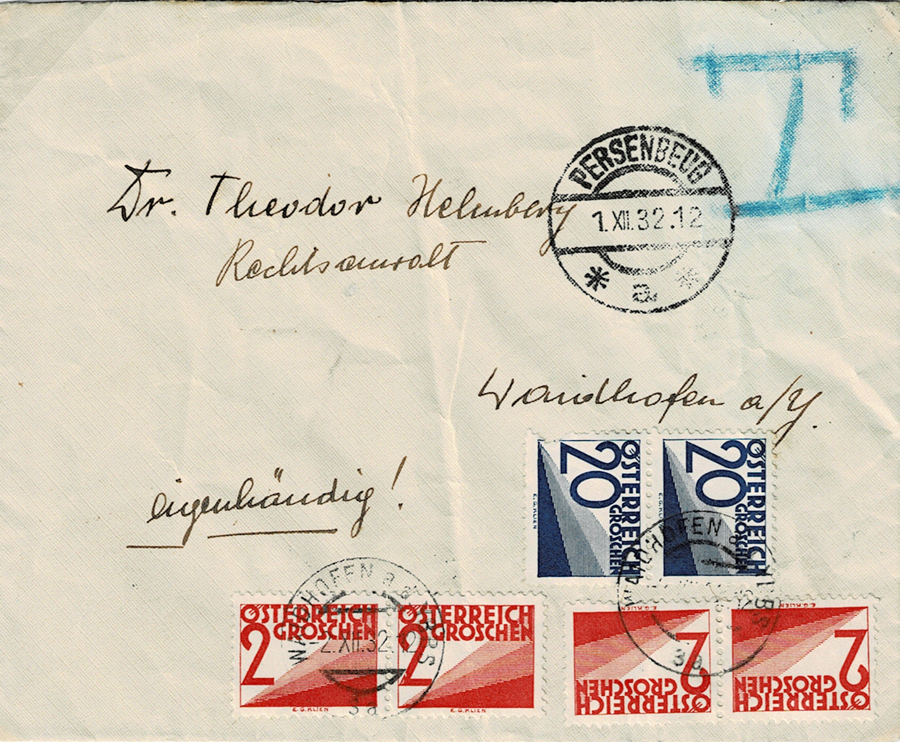 Inland letter, posted unpaid (to a lawyer!) in 1932. Rate was 24g. Large blue underlined T in crayon indicates a charge.