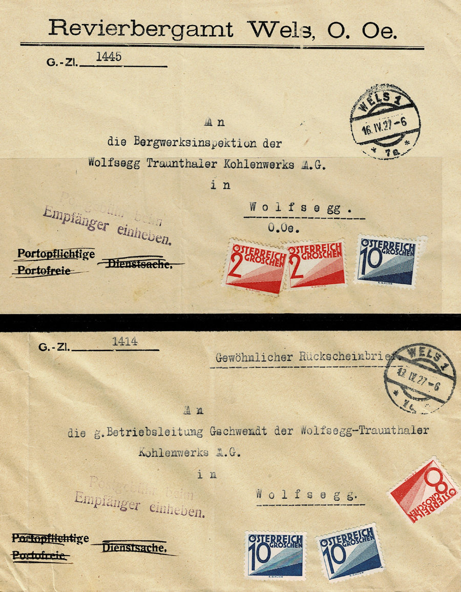 During the decade of validity of this postage due stamp issue, several values were added (as tabulated above) to deal with the steady rise in inland and foreign postage rates. The 10g value is known bisected on cover from the town of Stainz in Carinthia. Forgeries of the 24g and 39g values are known used at Andritz (the XII district of Graz), from April to October 1933. Mixed frankings with the 1922 Postage Due Set are also known. Imperforate specimens are known for many of the values.