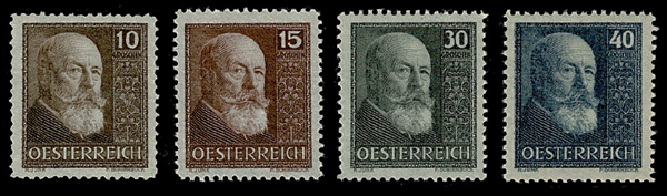 To commemorate the successful first decade of the First Republic, a stamp was issued on 5 November 1928 portraying the First Federal President, Dr Michael Hainisch, who was about to retire. There are four values, all having the same portrait design: 10g brown, 15g dark carmine, 30g dark grey, and 40g dark blue. They were sold only at selected Post Offices, and only in complete sets at twice the face value, to raise funds for war orphans and children of the war-injured (so a set cost 1S90.) The stamps were designed by Rudolf Junk and engraved by Ferdinand Schirnböck. 100,000 sets were printed in recess at the Austrian State Printing Works and line perforated 12½ The stamps were valid until 30 April 1929.