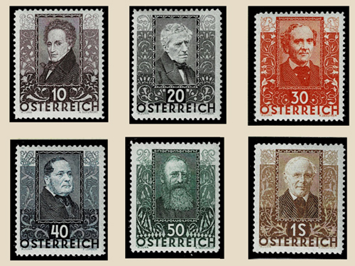 On 12 September 1931 a set of six beautiful portrait stamps (ANK524-529) was issued to depict Austrian Writers: 10g purple: Ferdinand Raimund (1790-1836); 20g grey: Franz Grillparzer (1791-1872); 30g vermilion: Johann Nestroy (1801-1862); 40g blue: Adalbert Stifter (1805-1868); 50g green; Ludwig Anzengruber (1839-1889); 1S brown: Peter Rosegger (1843-1918).