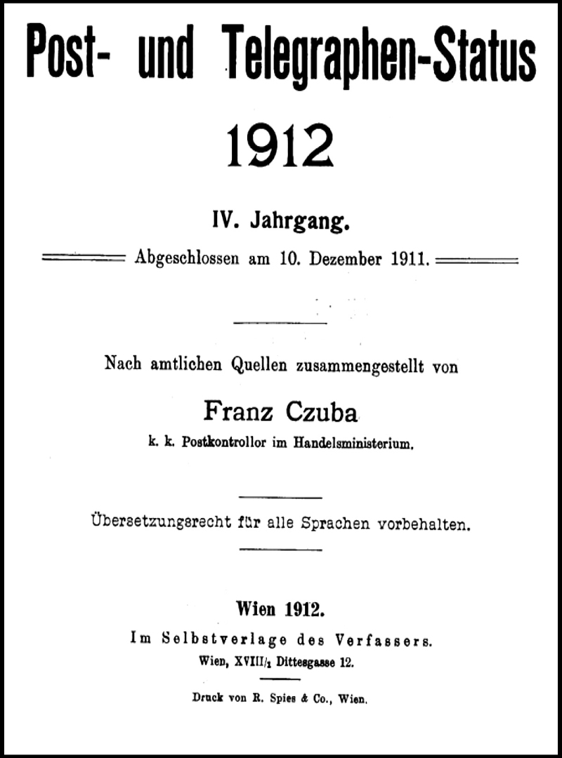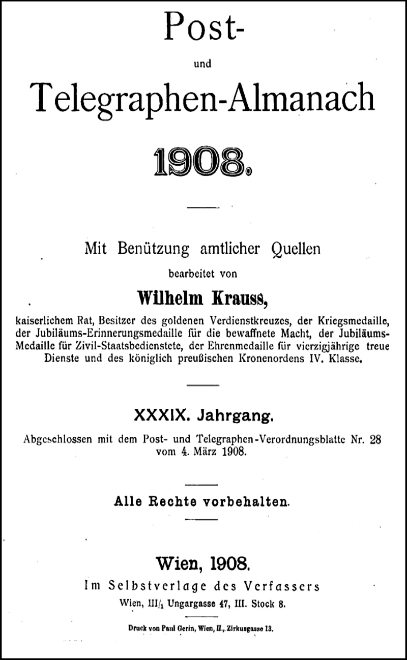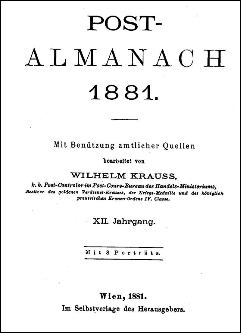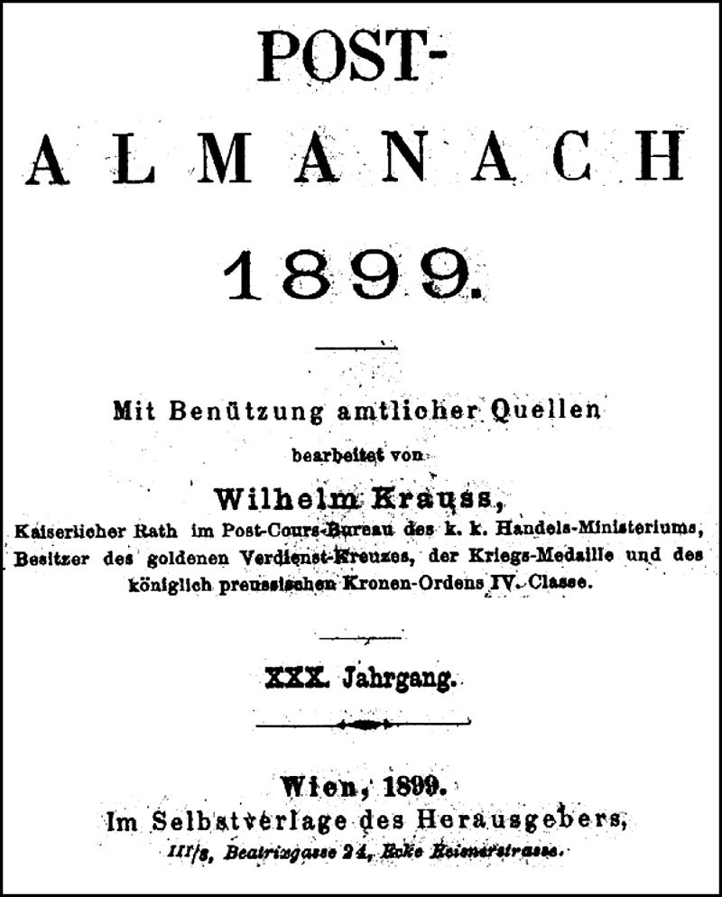 It seems to have been officially approved, but published as the private initiative of a senior official! The publisher was Wilhelm Krauss from 1870 to 1908, and Franz Czuba from 1909 to 1913. The Ministry of Trade took it over in 1914. Problems with the Post-Almanach include:
