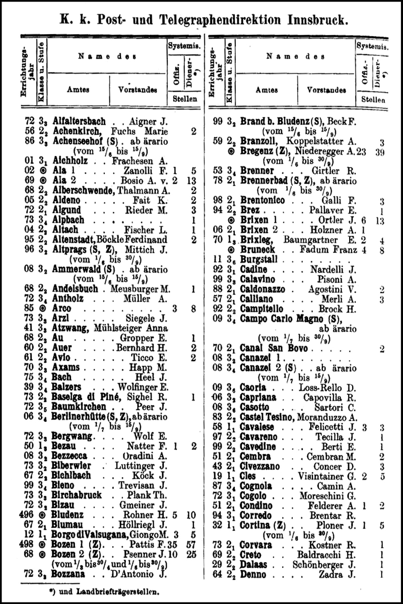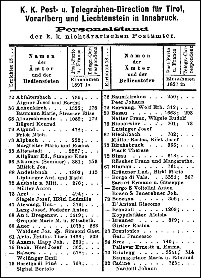 Weis & Stern: Eröffnungsdaten der Postämter, Telefonsprechstellen und Telegraphenstationen in Nord- und Südtirol, Vorarlberg und Liechtenstein bis 1900. This uses data from "Boten für Tirol und Vorarlberg" to list the opening dates of post-, telegraph- and telephone-offices.