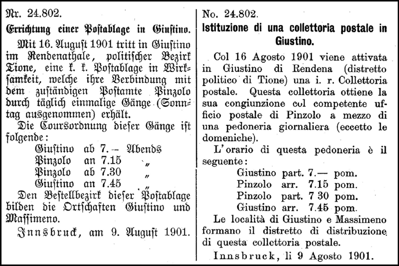 Because the Innsbruck Directorate covered Süd-Tirol, some instructions (such as this for the opening of a Postablage) were produced in dual-languages: German and Italian. These Instructions also served to keep postal employees in touch with their colleagues (promotions, retirements, dismissals and deaths appear) and to advertise posts to existing staff.