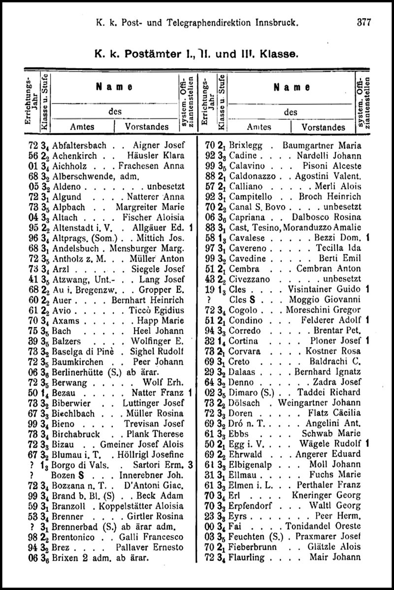 This is the title page of Krauss' 1899 issue, which is 105x140 mm with 359 pages. This one lists the k. k. nicht-ärarische offices attached to the Innsbruck Directorate (note the inclusion of Liechtenstein); their date of opening; the income in 1897 from postal and telegraphic transactions; and the name of the person(s) in charge. Krauss' last Almanach, for 1908 was 145 x 190 mm and had 607 pages. Here is one, a page of the 1908 list of Post Offices. Next to the year of opening of each office is the Class and Ranking, the name of the person in charge, and the numbers of official positions.