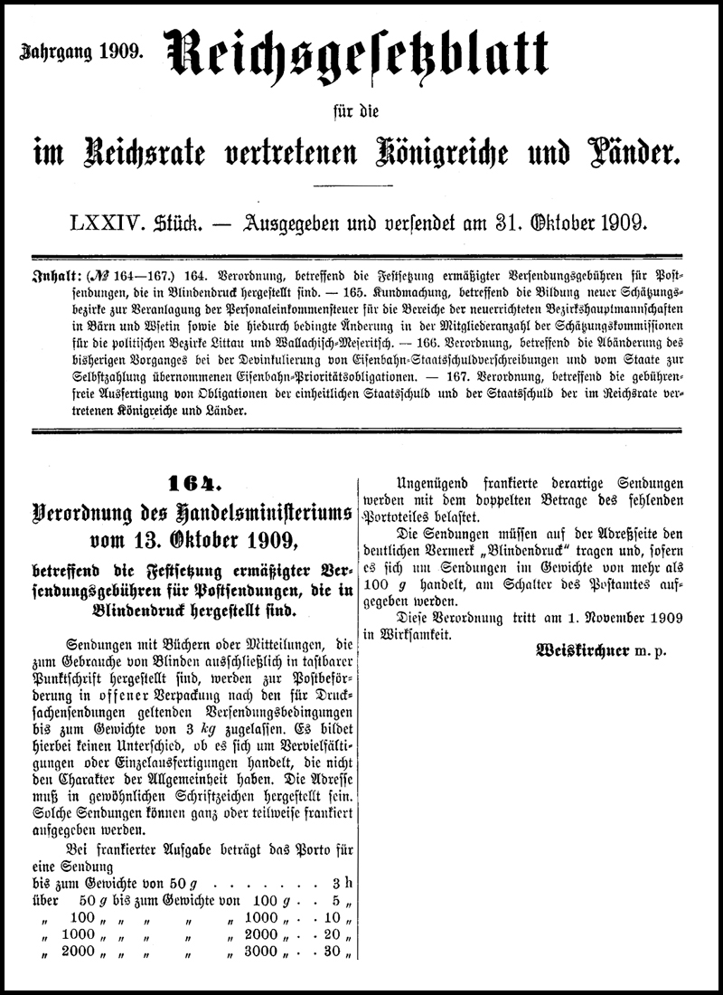 Here are the Verordnung des Handelsministeriums of 13 October 1909 giving the details of a rate reduction for Braille items in the inland post; and a subsequent Verordnungsblatt of 1910, extending it to Bosnia-Herzegowina. As the Verordnung des Handelsministeriums is dated 13 October 1909, was published on 31 October, and came into effect on the 1st of November, ie the day after publication, it is unclear how the postal staff knew in time. This oddity is quite often found, and remains without factual explanation.