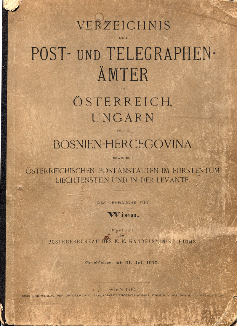 | 1910 | Postkursbureau des k.k. Handelsministeriums | Verzeichnis der Post- und Telegraphen-Ämter in Österreich, Ungarn und in Bosnien-Hercegovina sowie der österreichischen Postanstalten im Fürstentum Liechtenstein und in der Levante | Druckerei- u. Verlags-aktiengesellschaft vorm. R.V. Waldheim, Jos. Eberle & co. |