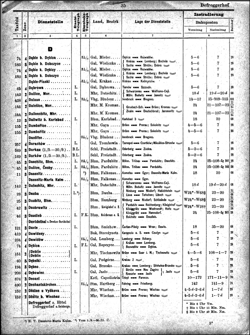 The 1906 book entitled Allgemeines Postlexicon was published by the KK Handelsministerium and contains 1568 pages. As well as listing localities and alternative names, it gives (inter alia) Province; Bahnhof; Bezirksgericht; Ortsgemeinde; and the nearest post office.