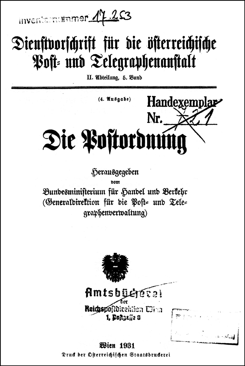 It is not known to us if the Dienstvorschrift was issued routinely; nor what if any relationship it had to the Dienstbücher discussed next. At least one other Dienstvorschrift is known, issued in 1929 by the "BM f. Handel u. Verkehr, Generaldirektion f. Post- u. Telegraphenverwaltung" and titled "Dienstvorschrift f. d. österr. Post- u. Telegraphenanstalt II. Abteilung, 2. Band / Das Portofreiheitsaufhebungsgesetz nebst den Durchführungsverordnungen".