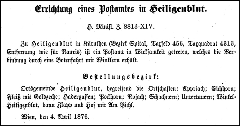 Here for an example is PVOB of 4 April 1876 concerning the opening of a Post Office in Heiligenblut. Note the Taxfeld and Taxquadrat numbers; these were used in the calculation of postage rates.