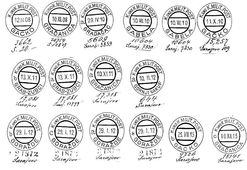 This was a series of books in which strikes were collected of all cancellers issued through Vienna in the period 1880s to 1918. A full discussion of these is in the late Dr Christine Kainz article in Wurth’s Handbook volume XVI. Most regrettably, many of the books have vanished, some have been extensively robbed, and all are too fragile to be handled. However, thanks to Dr Kainz, photocopies of most of the surviving pages [Galicia, Bukowina, Dalmatia, Bosnia-Herzgowina, Kustenland, Krain] are in the possession of the APS and/or PKMI. A typical piece of these books is illustrated here.