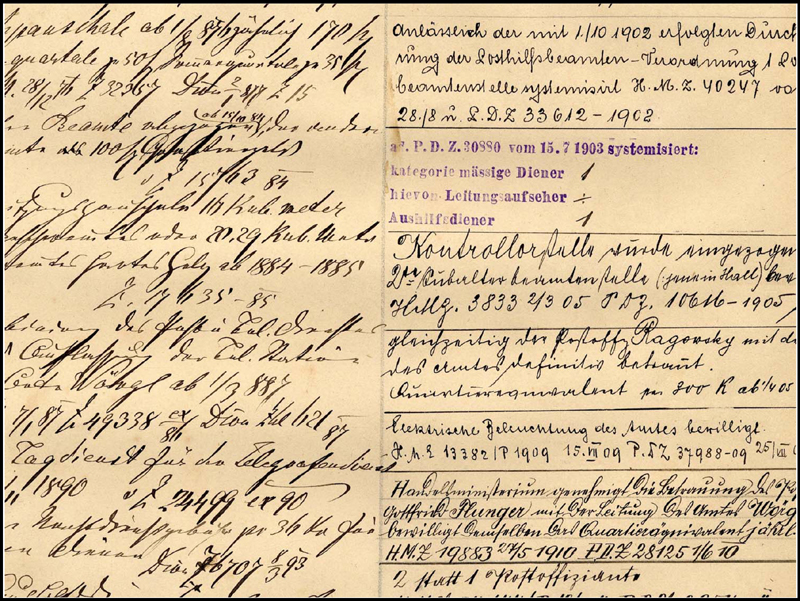 The Land Archives (eg the Tiroler Landesarchiv) often contain correspondence between local government, central government, and the local and central postal authorities. That is, between the Statthalterei (which later became the Landeshauptmannschaft), the Handelsministerium (Postal section), and the Postal Directorates. The correspondence can concern letters from communities asking for a new post-office and/or postal routes; the opening of a Post Office or Postablagen; the appropriate name for a new post-office or Postablage; orders for postmarks and others. One can find agreements between Postal authorities and private persons on a Special Post Office. Offices opened for military manoeuvres, and others whose opening was agreed but prevented by wars (especially in 1914) also leave traces in these archives. Useful index terms are Post, Telegraph and Telephon.