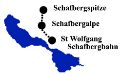 ![]() | The Schafbergbahn starts in Sankt Wolfgang am Wolfgangsee, a picturesque small town situated between steep mountain slopes and the lake, and leads up to the summit of the Schafberg (1,783m). The railway is almost 6 kilometers long and rises over 1200m along its length. The summit provides a perfect vista of the whole region with its many deep blue lakes in the valleys and its many rocky peaks. |