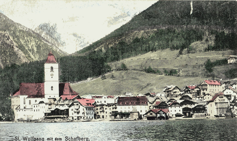 The postcard shows Sankt Wolfgang and the Wolfgangsee, with the Schafberg mountain behind.