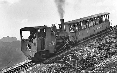 ![]() | Kraus loco 997.307 ascending the Schafberg in the late 1940s, giving some impression of the very steep gradient. The locomotive is actually 999.102 in the ÖBB numbering system but the engines retained their Reichsbahn numbering until the mid-1950s. |