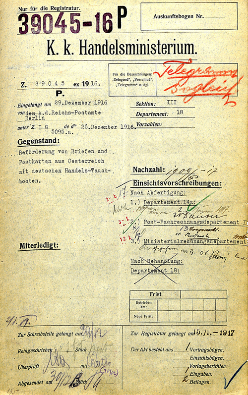 | Das k. k. HM hat mit dem Erlass vom 29. Dez. 1916, Zl. 39.045/P Folgerndes anher eröffnet: "Zur Beförderung mit deutschen Handels-Tauchbooten können bis auf weiteres versuchsweise gewöhnliche Briefe ohne Wareninhalt und Postkarten (ohne Antwortkarte) nach den Vereinigten Staaten von Amerika und nach neutralen Ländern im Durchgang durch die Vereinigten Staaten (Mexiko, Mittel- und Südamerika, Westindien, China, Niederländisch Indien, den Philippinen usw.) bei den k. k. PÄ unter den nachstehenden Bedingungen aufgegeben werden: | The Austro-Hungarian Ministry of Trade announced in a decree of 29 Dec 1916 as follows: "Until further notice, ordinary letters (without enclosed goods) and postcards (without reply-card) to the USA and to neutral countries routed through the USA (Mexico, Central & South America, the West Indies, China, Dutch East Indies, the Philippines etc) may be handed to the Austrian Post Office for forwarding by German cargo-submarine, under the following conditions: |