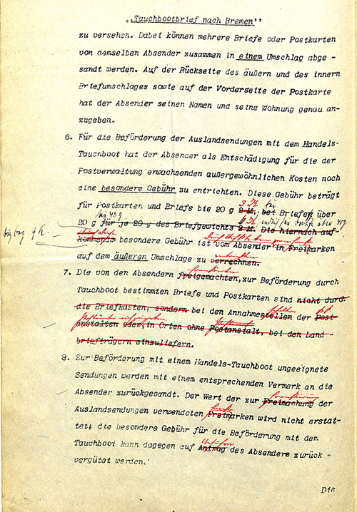 | Wann Briefsendungen mit den Handelstauchbooten befördert werden, wird nicht bekannt gegeben. Die Absender müssen daher unter Umständen mit einer längeren Beförderungsdauer rechnen. | The sailing date of the submarine will not be made public; senders must expect a long delay. |