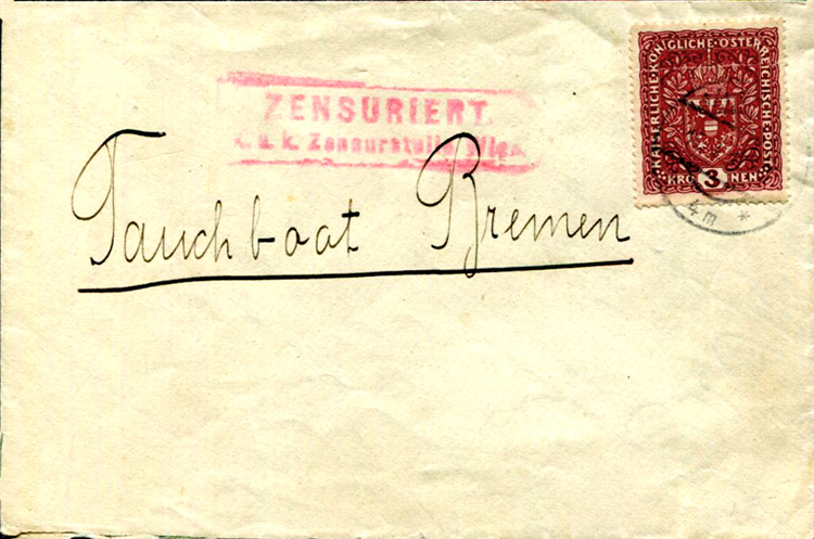 This article will concentrate on the Austrian aspects of Tauchbootbriefe, which were a small part of the whole. When WWI began, the British created a naval blockade in the North Sea; this prevented Germany importing raw materials such as rubber, zinc, nickel, and cotton. Herr Alfred Lohmann, President of the Bremen Chamber of Commerce, suggested an unarmed cargo- and mail-carrying submarine service, enabling trade to continue between Germany and neutral countries such as the USA.